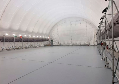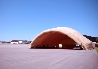 Air domes for aircraft maintenance and repair, offering protected workspaces for military aviation operations.