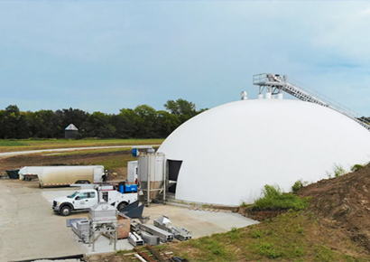 Monolithic dome for storing fertilizer blends, protecting against environmental factors.