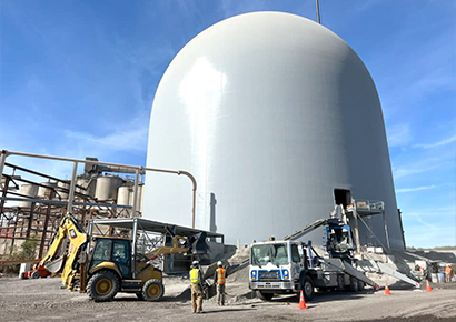 Monolithic dome silos for cement storage, ensuring dry and protected conditions.